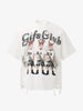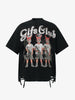 • Design Elements: Bold graphic print featuring devils with guns, distressed details at the bottom hem