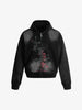 • Design Elements: Distressed graphic print, bold text design, hooded silhouette